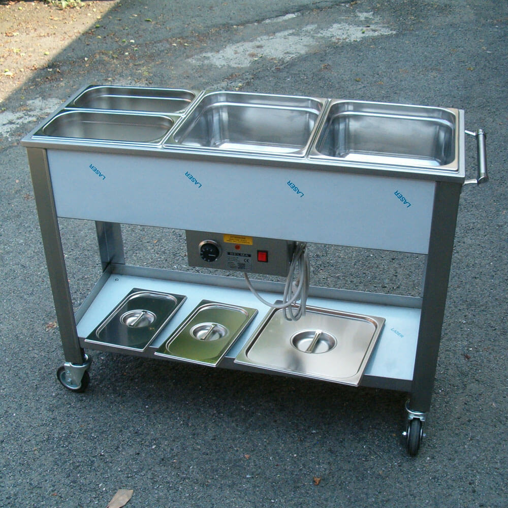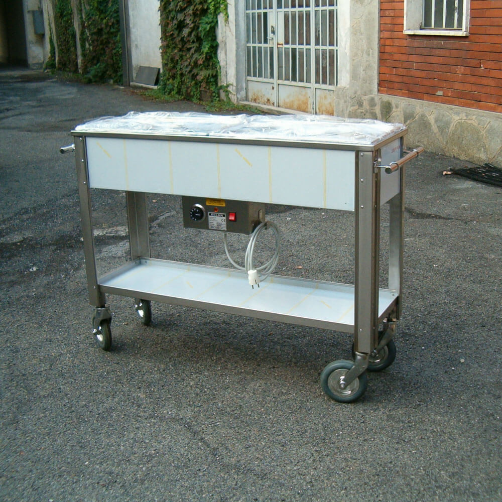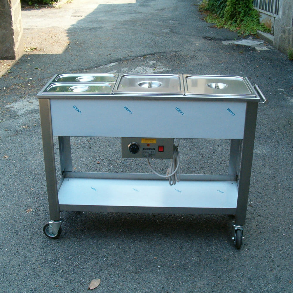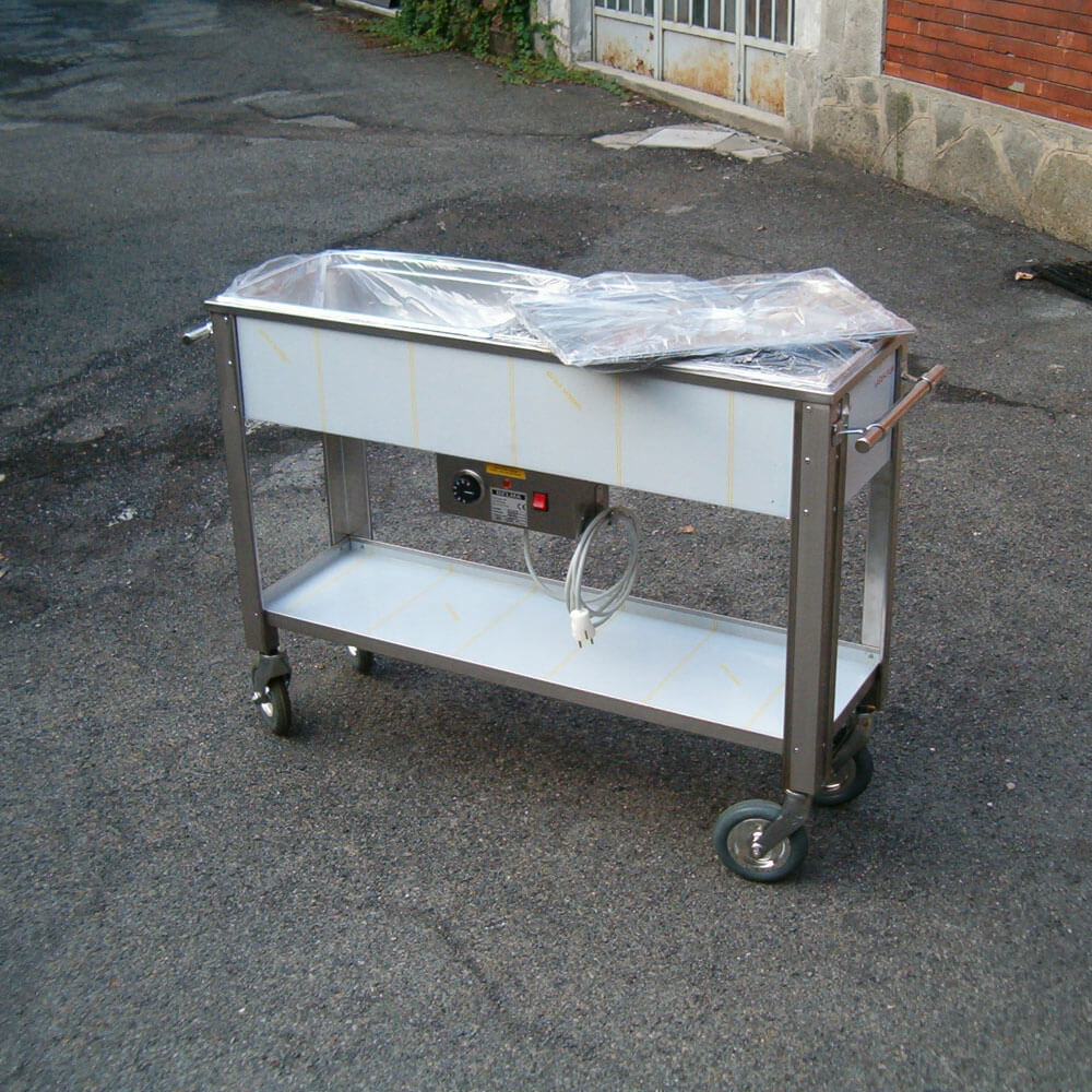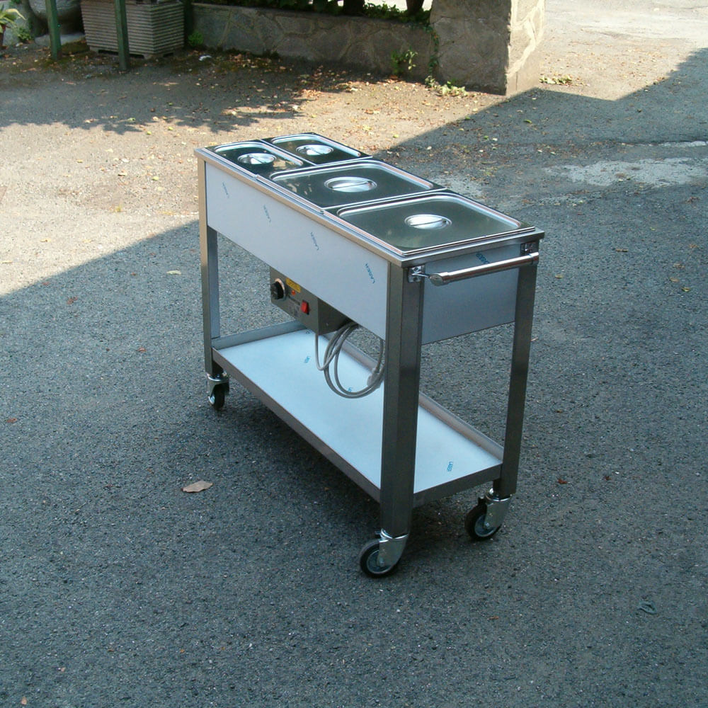 - Carrelli termici scaldavivande a bagnomaria costruiti in acciaio inox satinato AISI 304, dotati di vaschette Gastronorm di formato a richiesta.