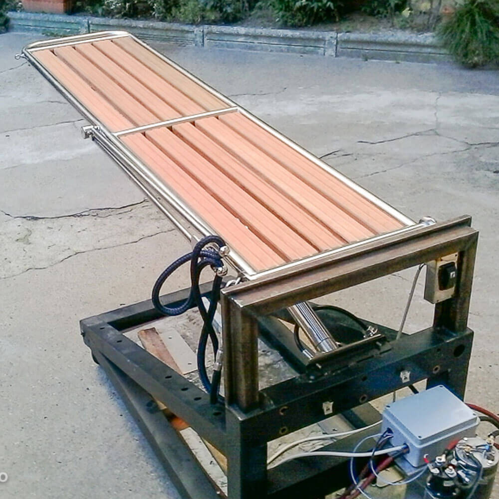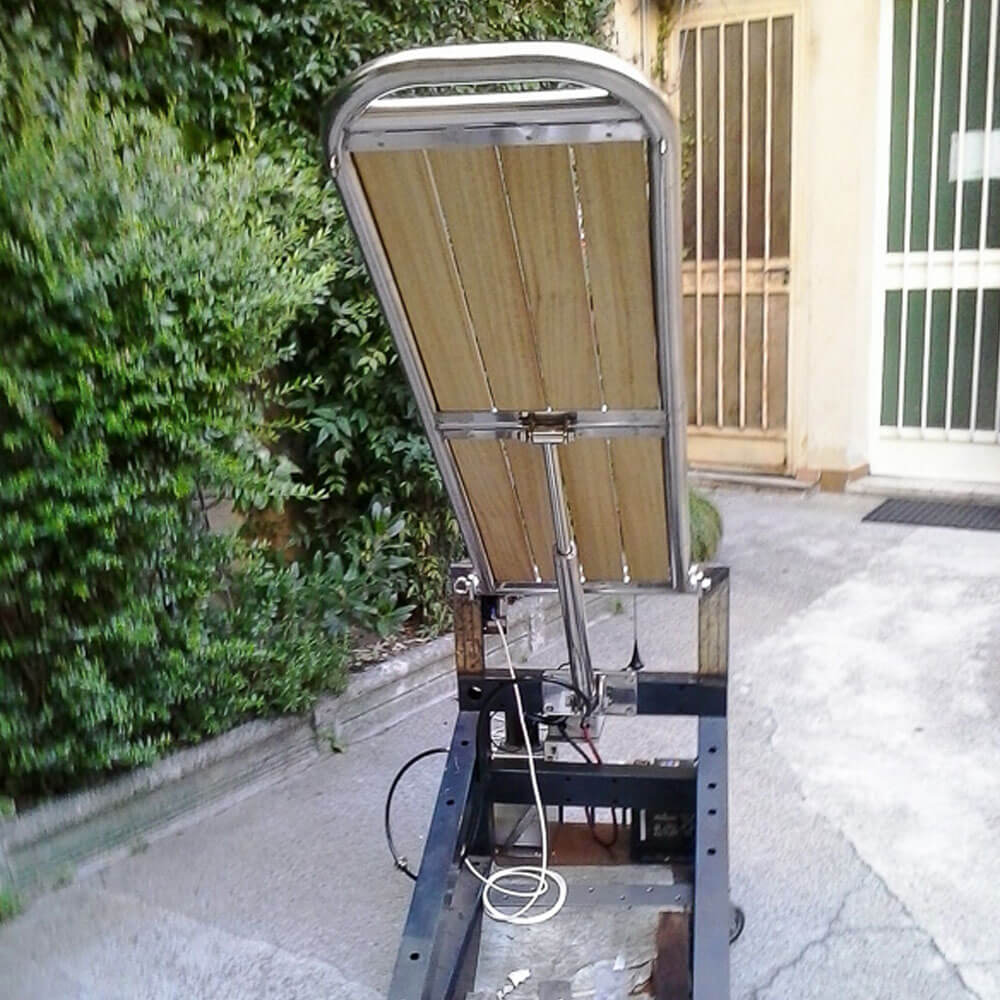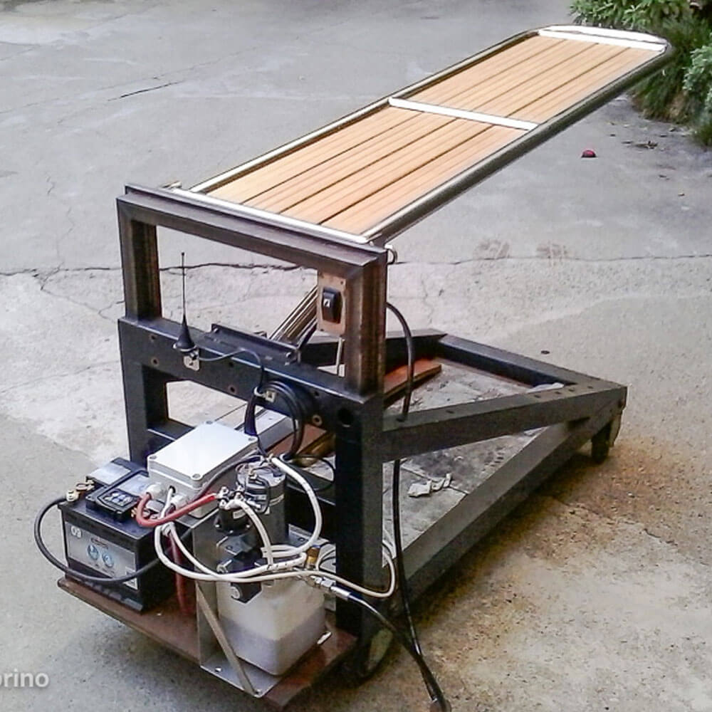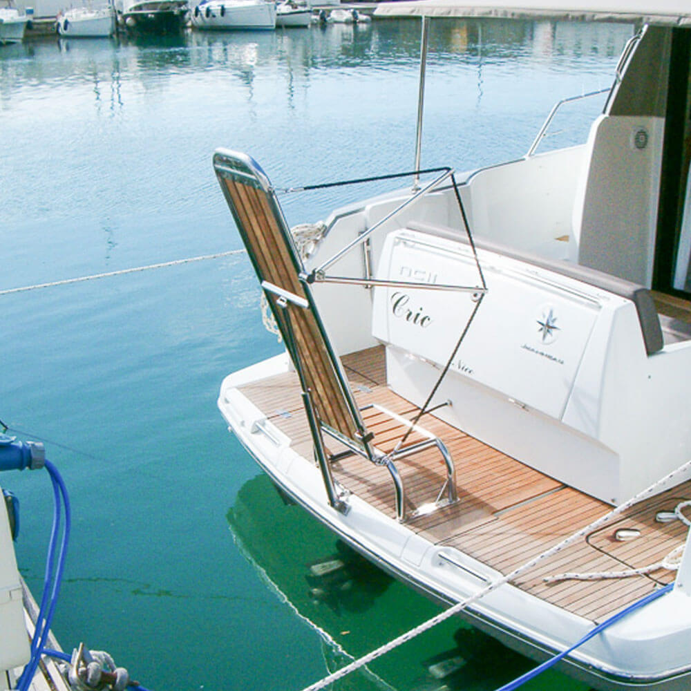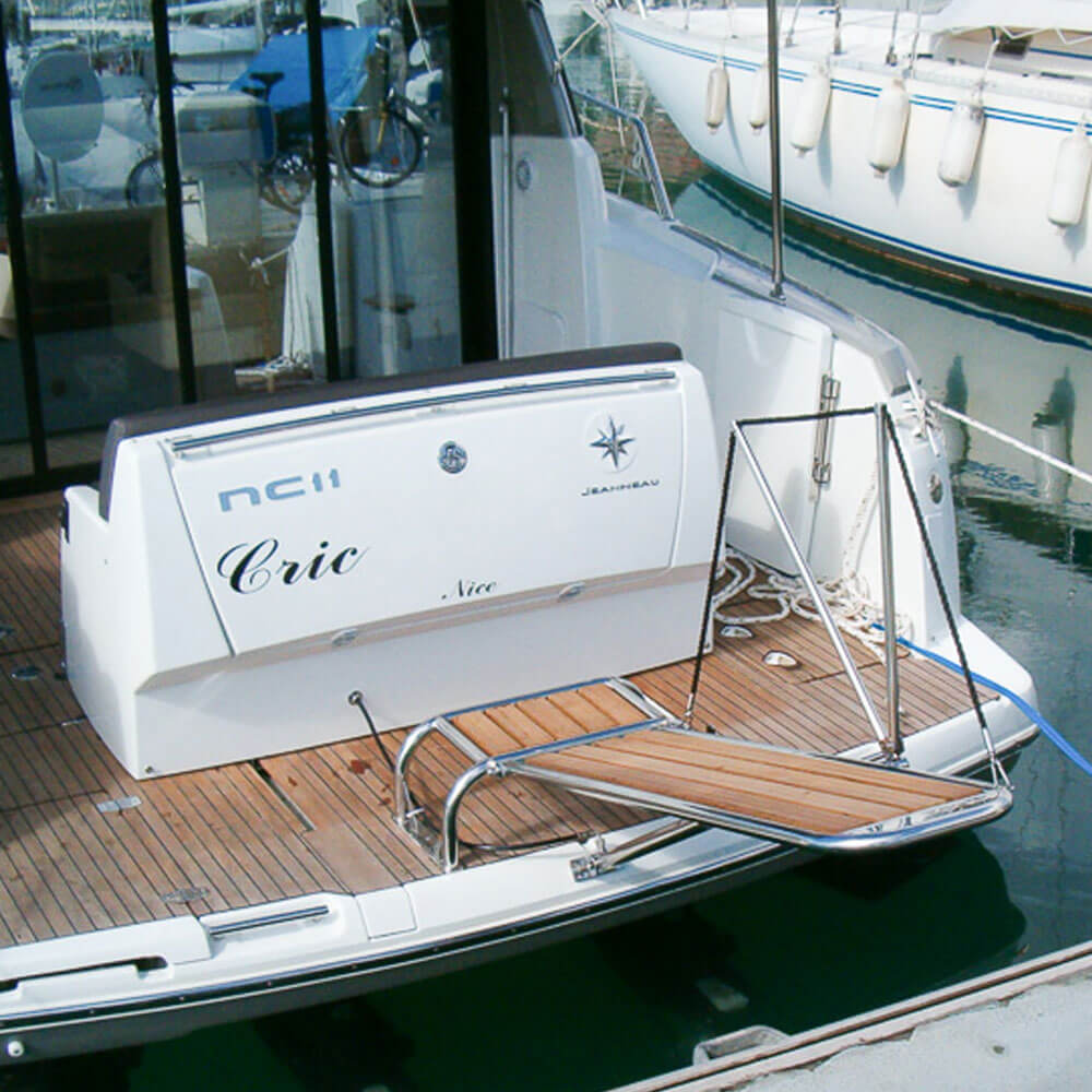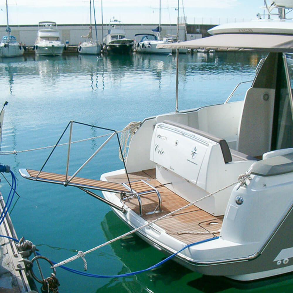 - Passerella in tubolare di acciaio inox Ø 35 mm AISI 316 lucido, camminamento in listellare di legno marino, completa di staffa da specchio di poppa per la rotazione, pistone tuffante in acciaio inox con corsa 500 mm, staffa supporto pistone da specchio di poppa, tubo flessibile R7 1/4″ per olio, compreso di raccordi in acciaio inox AISI 316, centralina oleodinamica con staffa di fissaggio e centralina elettronica, olio idraulico 46, interruttore alzo/abbasso da incasso per pozzetto, n. 2 telecomandi, manuale di istruzioni.