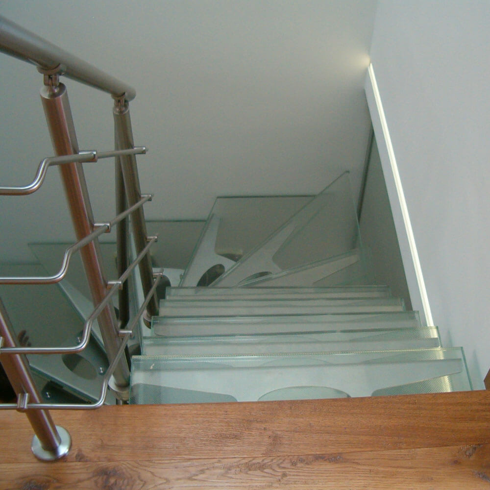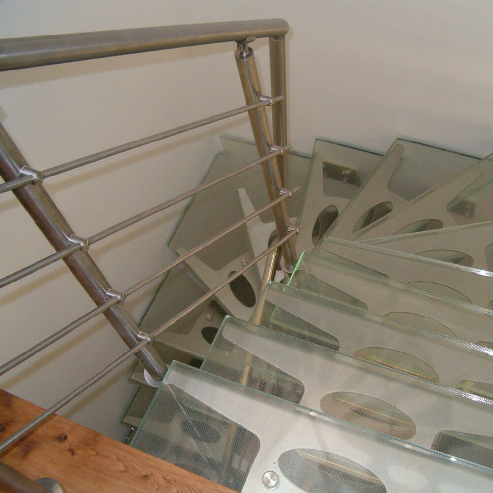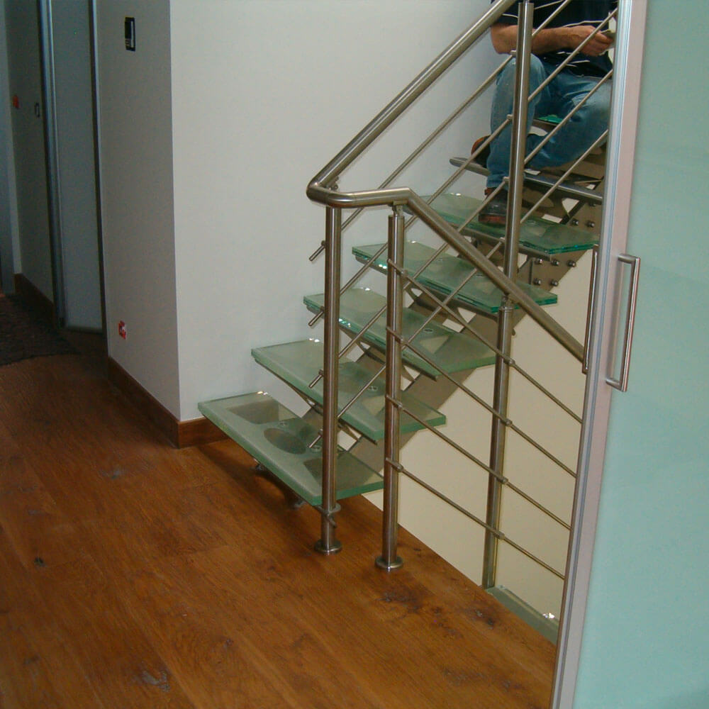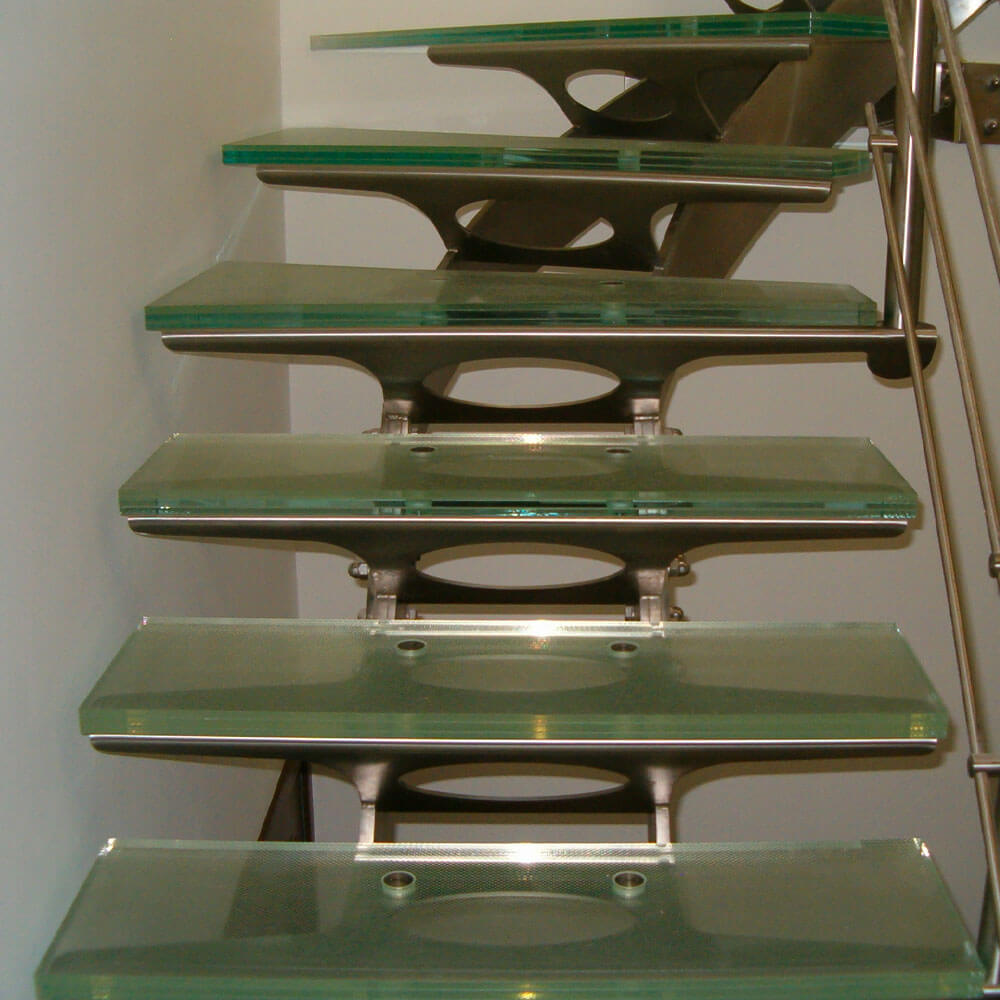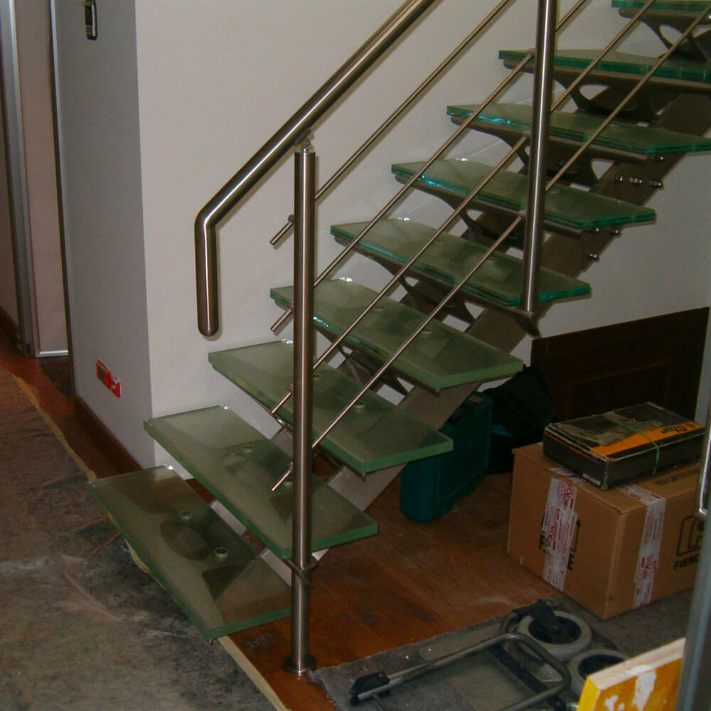 Per un alloggio di prestigio abbiamo realizzato una scala in acciaio inox e cristallo temperato stratificato antiscivolo.